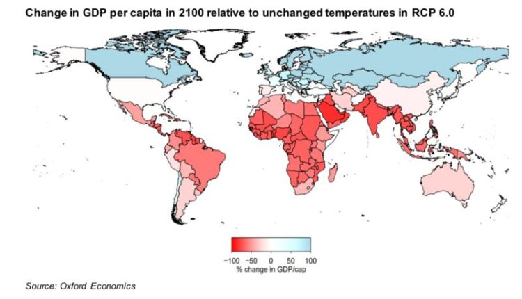 По мнению экспертов из Oxford Economics, больше всего пострадает экономика Индии: ВВП на душу населения в стране упадет на 90% к 2100 году, если выбросы парниковых газов в атмосферу не снизятся. Специалисты также предположили, каким мог бы быть этот показатель в разных странах, если бы средняя температура была на 1,1 °C ниже. Согласно прогнозу, он был бы значительно выше. Например, ВВП на душу населения в Нигерии мог бы быть на 35% больше, чем сейчас.