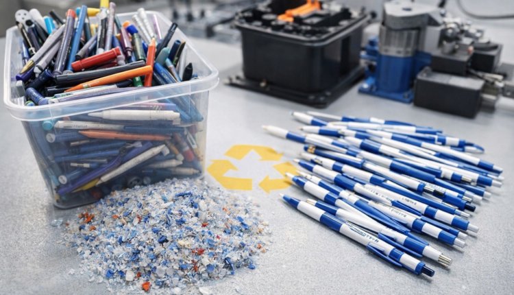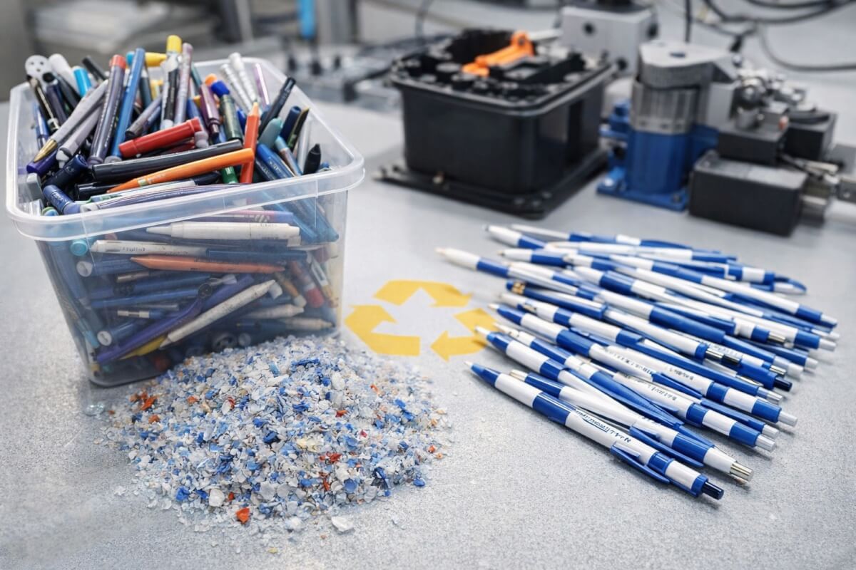 Процесс включал разборку ручек на отдельные элементы, удаление неперерабатываемых компонентов, измельчение и очистку пластика. Затем материал переплавляли с добавлением красителя и формовали новые корпуса и колпачки. После этого изделия брендировали методом шелкографии и укомплектовывали новыми стержнями.