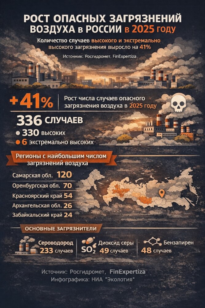 В 2025 году в России резко увеличилось число случаев опасного загрязнения атмосферного воздуха. По данным аналитической службы FinExpertiza, основанным на оперативной статистике Росгидромета, количество зарегистрированных эпизодов высокого и экстремально высокого загрязнения достигло 336 случаев, что на 41% больше, чем годом ранее.