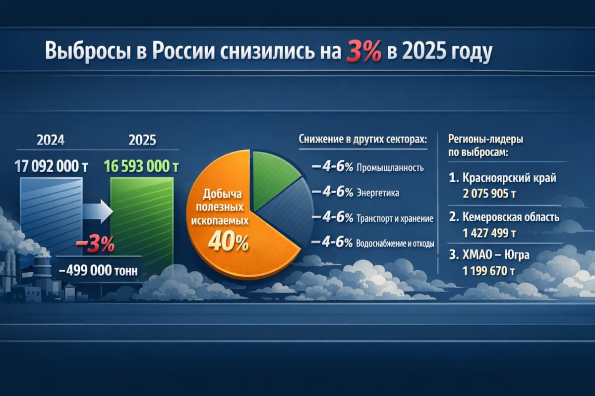Как следует из представленных материалов, ключевым источником выбросов по-прежнему остается сектор добычи полезных ископаемых, на который приходится около 40% общего объема. При этом в ряде других отраслей — обрабатывающей промышленности, энергетике, транспортировке и хранении, а также в сфере водоснабжения и обращения с отходами — отмечено снижение показателей в диапазоне 4–6%.